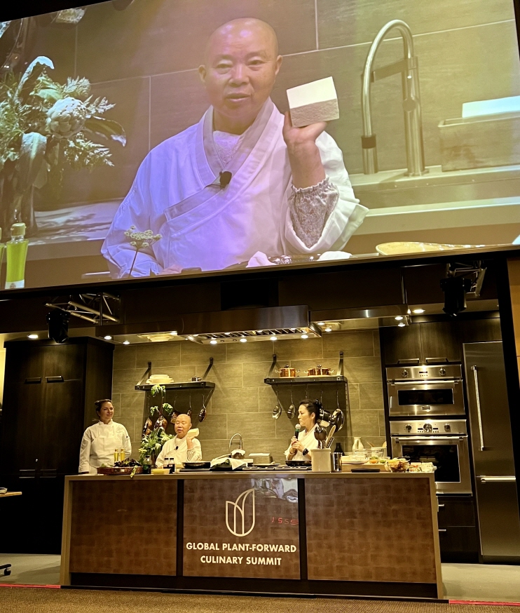 ▲ Buddhist monk Jeong Kwan, the master of temple food, demonstrates plant-based dishes using Pulmuone tofu at the "Global Plant-Forward Culinary Summit" held by the Culinary Institute of America in Napa, CA in May.